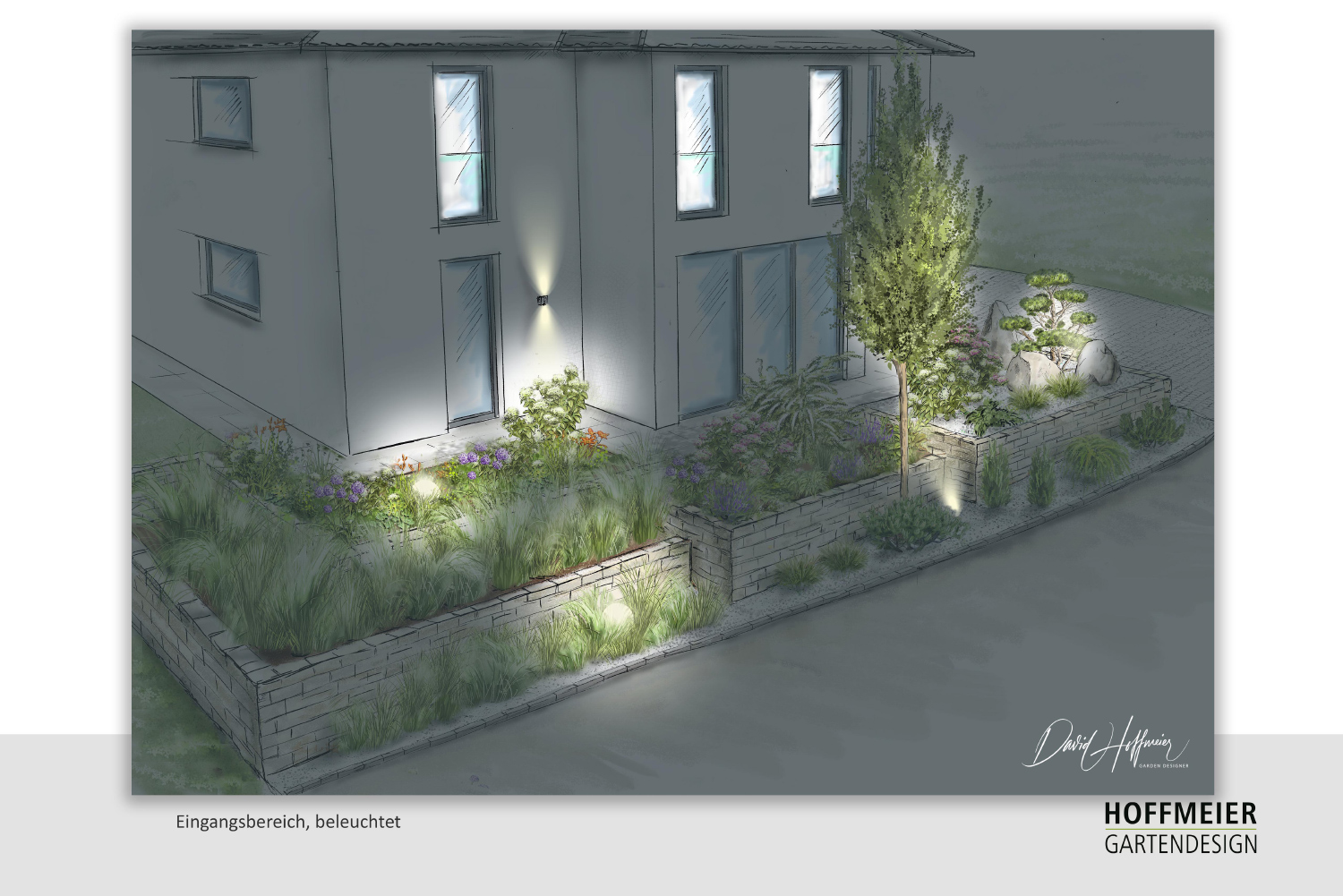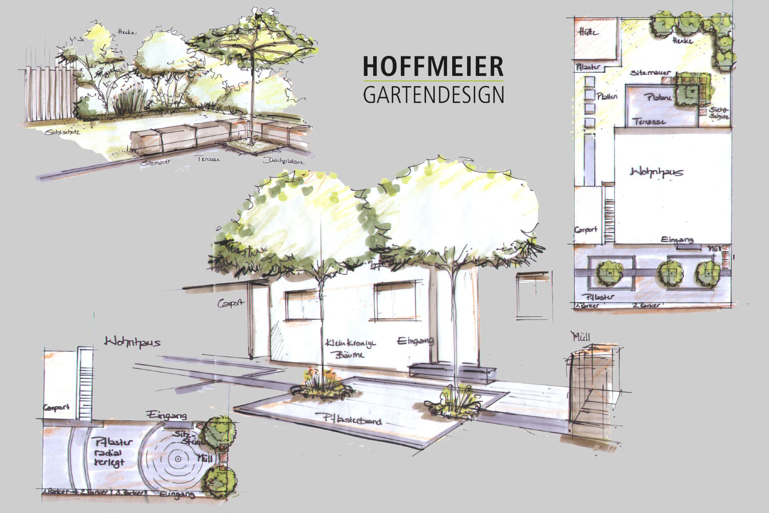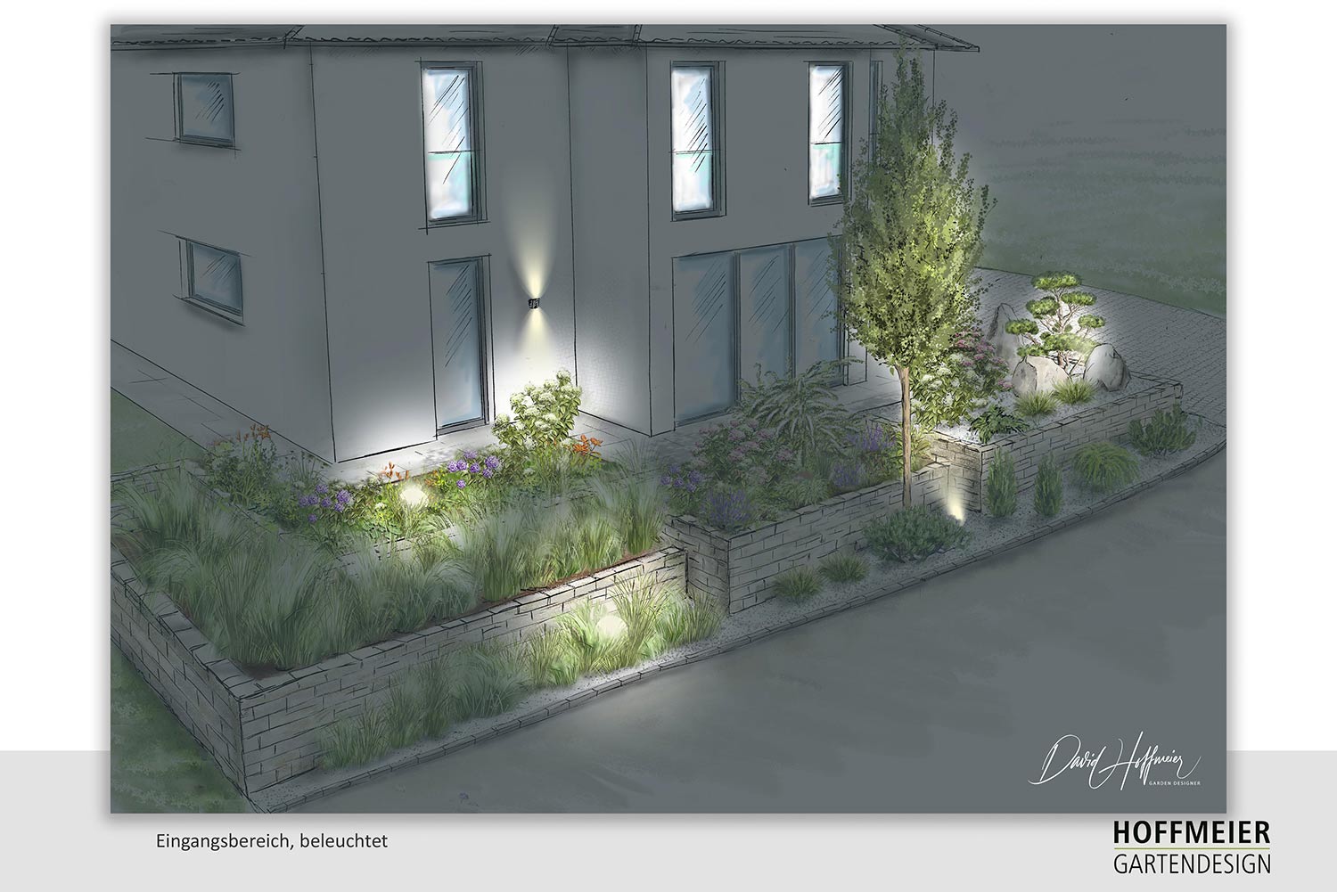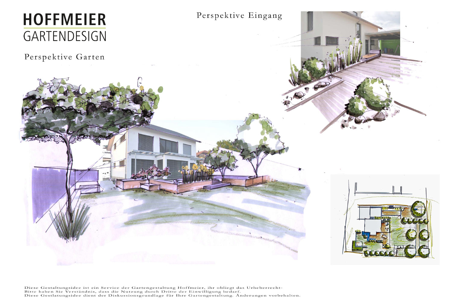 Wir zeichnen verschiedene Perspektiven für Sie von Hand, damit Sie eine Vorstellung von möglichen baulichen Änderungen, Bepflanzungen und Beleuchtungsinstallationen erhalten.