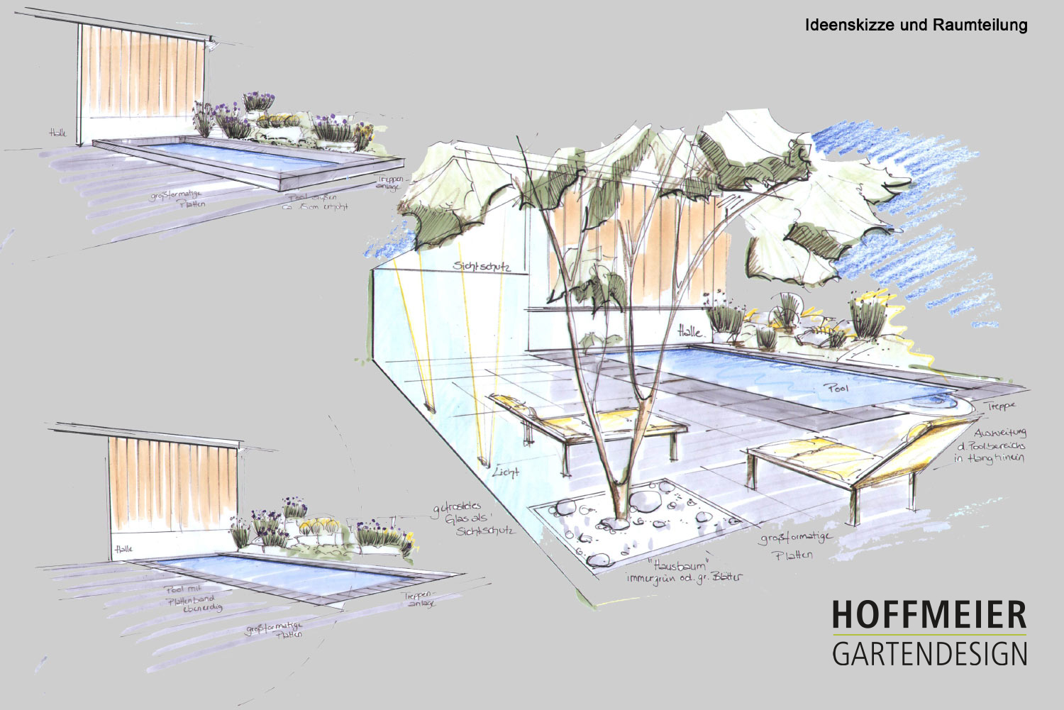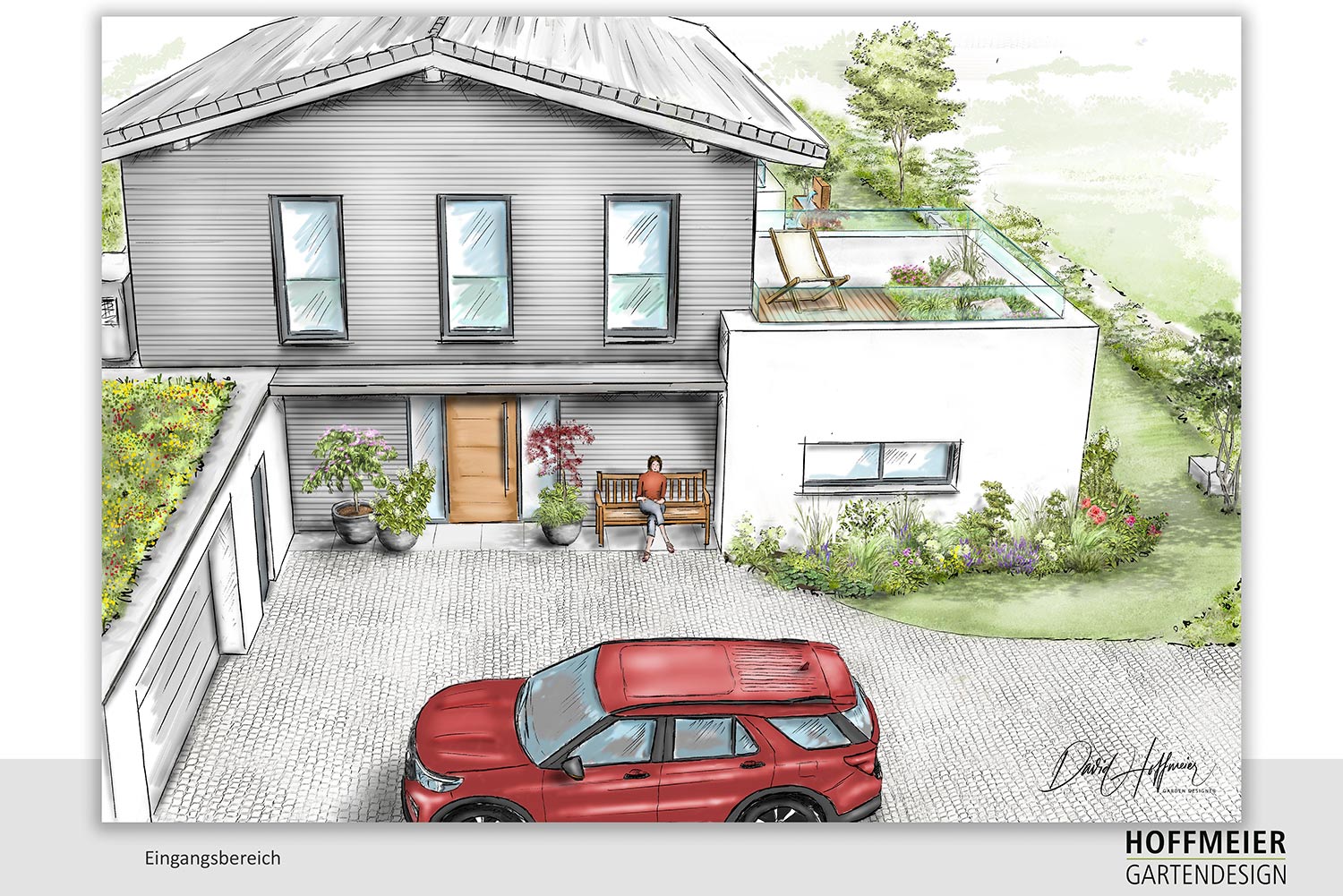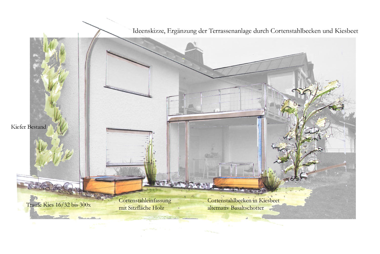 Wir zeichnen verschiedene Perspektiven für Sie von Hand, damit Sie eine Vorstellung von möglichen baulichen Änderungen, Bepflanzungen und Beleuchtungsinstallationen erhalten.