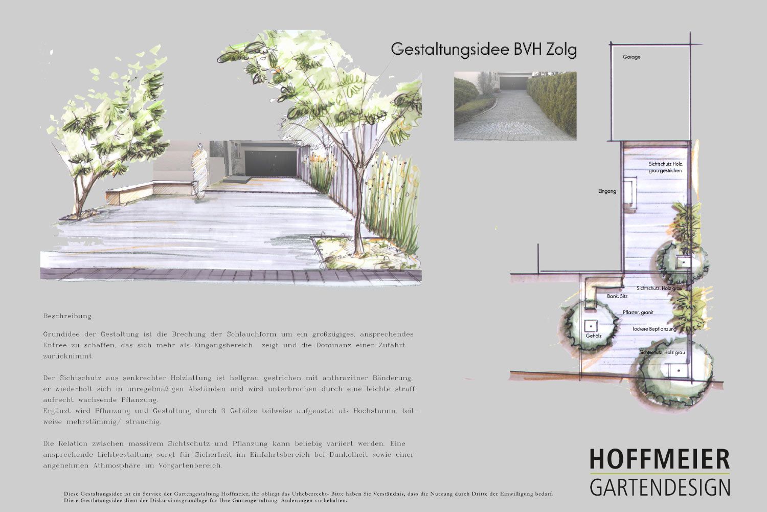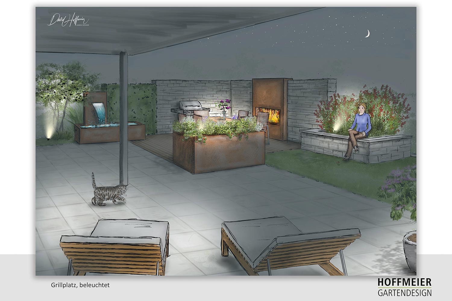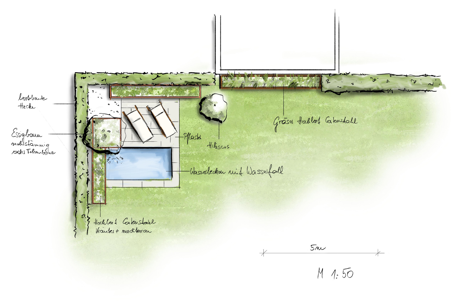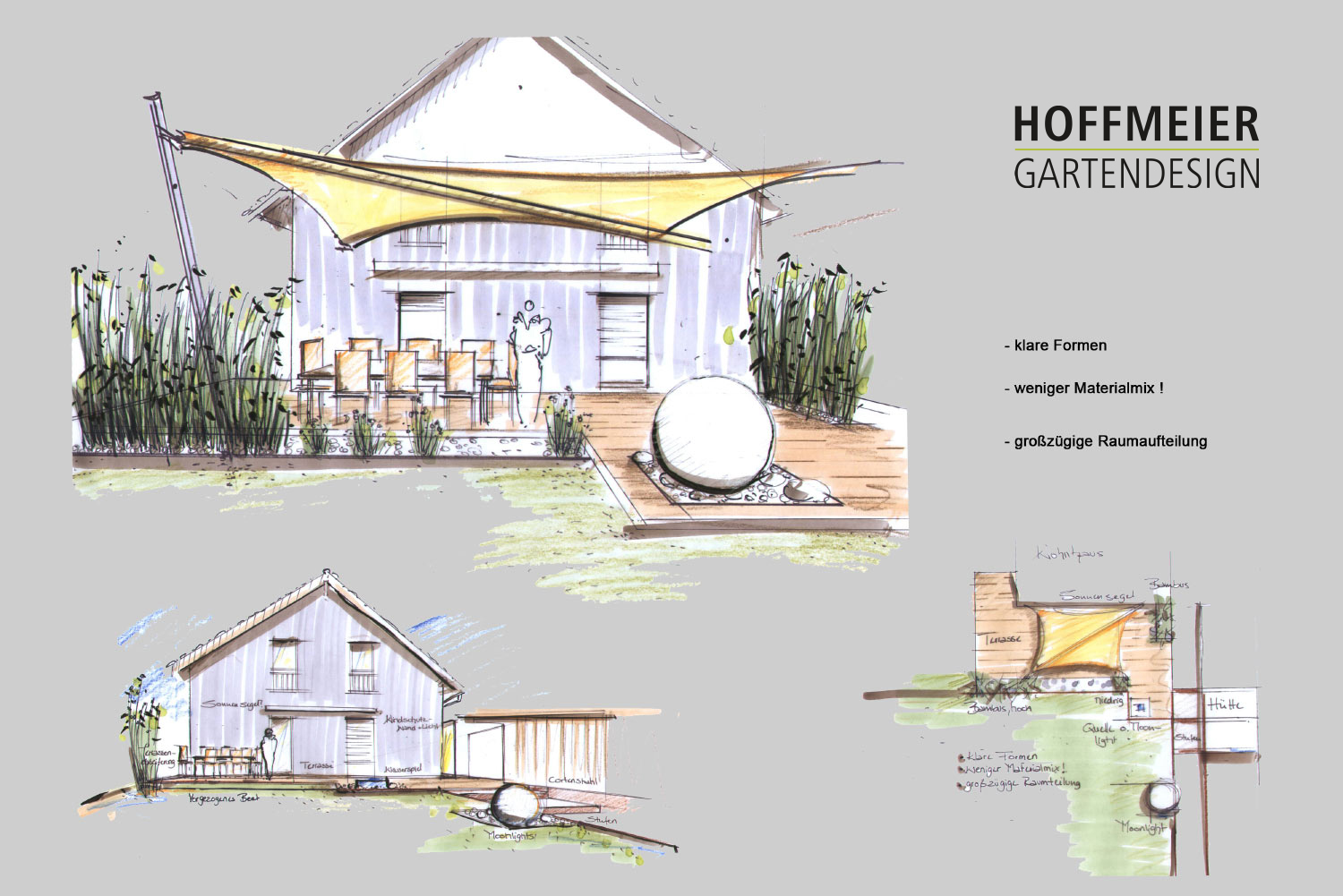 Wir zeichnen verschiedene Perspektiven für Sie von Hand, damit Sie eine Vorstellung von möglichen baulichen Änderungen, Bepflanzungen und Beleuchtungsinstallationen erhalten.